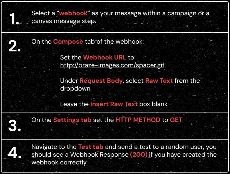 By configuring a blank webhook message step within Braze, you're setting up an HTTP GET request to a specific endpoint within Braze itself - this endpoint contains no data (click the link to view: https://braze-images.com/spacer.gif), therefore no actual content is sent to the user but a webhook message send is logged against the user profile. This setup provides a controlled way to simulate processes within the Braze environment without affecting user experience, external integrations or live campaigns.